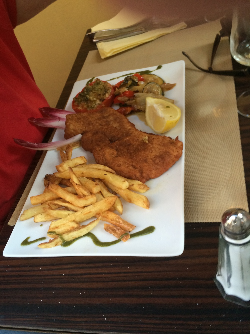 In the late evening the temperature had cooled even further which made it very pleasant for an evening walk before dinner. We settled on what looked to be a nice little place in a side street a few streets back from the main streets. It was quieter and fortunately less smokers were here (actually none which is very rare in France).