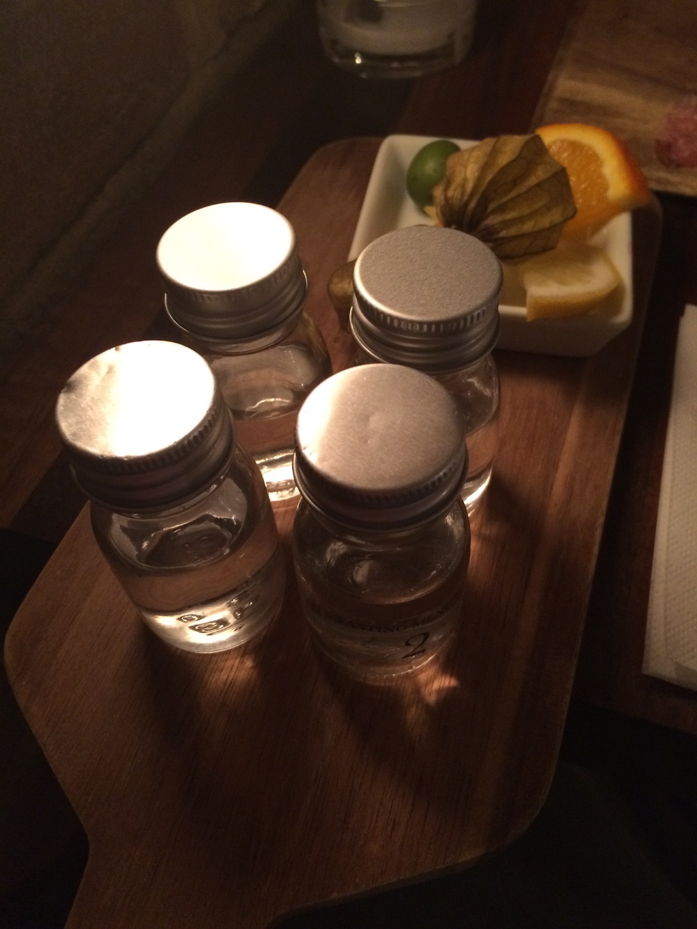 The tasting board arrived - 4 vials of selected Gins and accompanying garnishes for each. Two large ice filled glasses then arrived - each Gin deserves its own fresh glass.