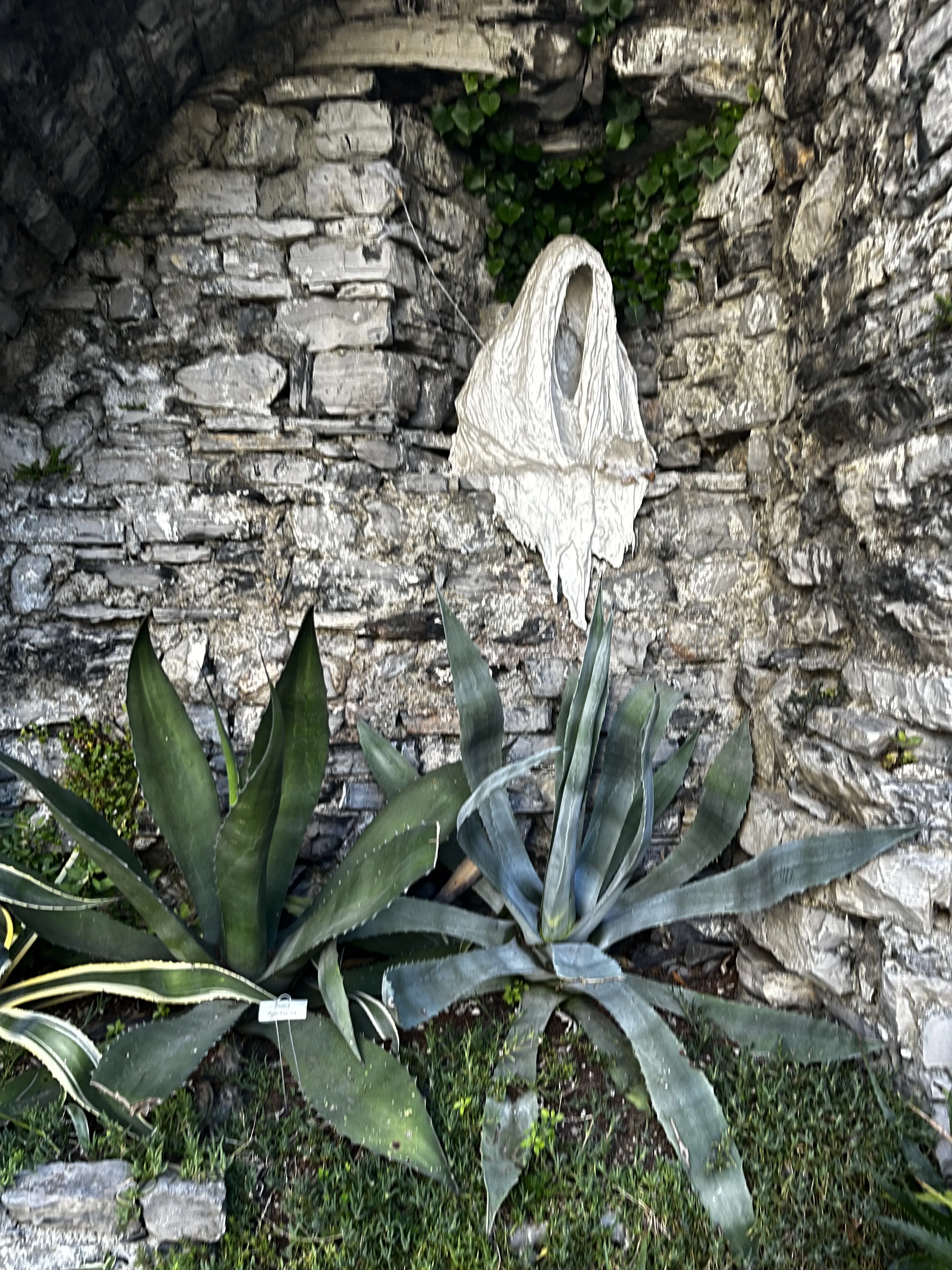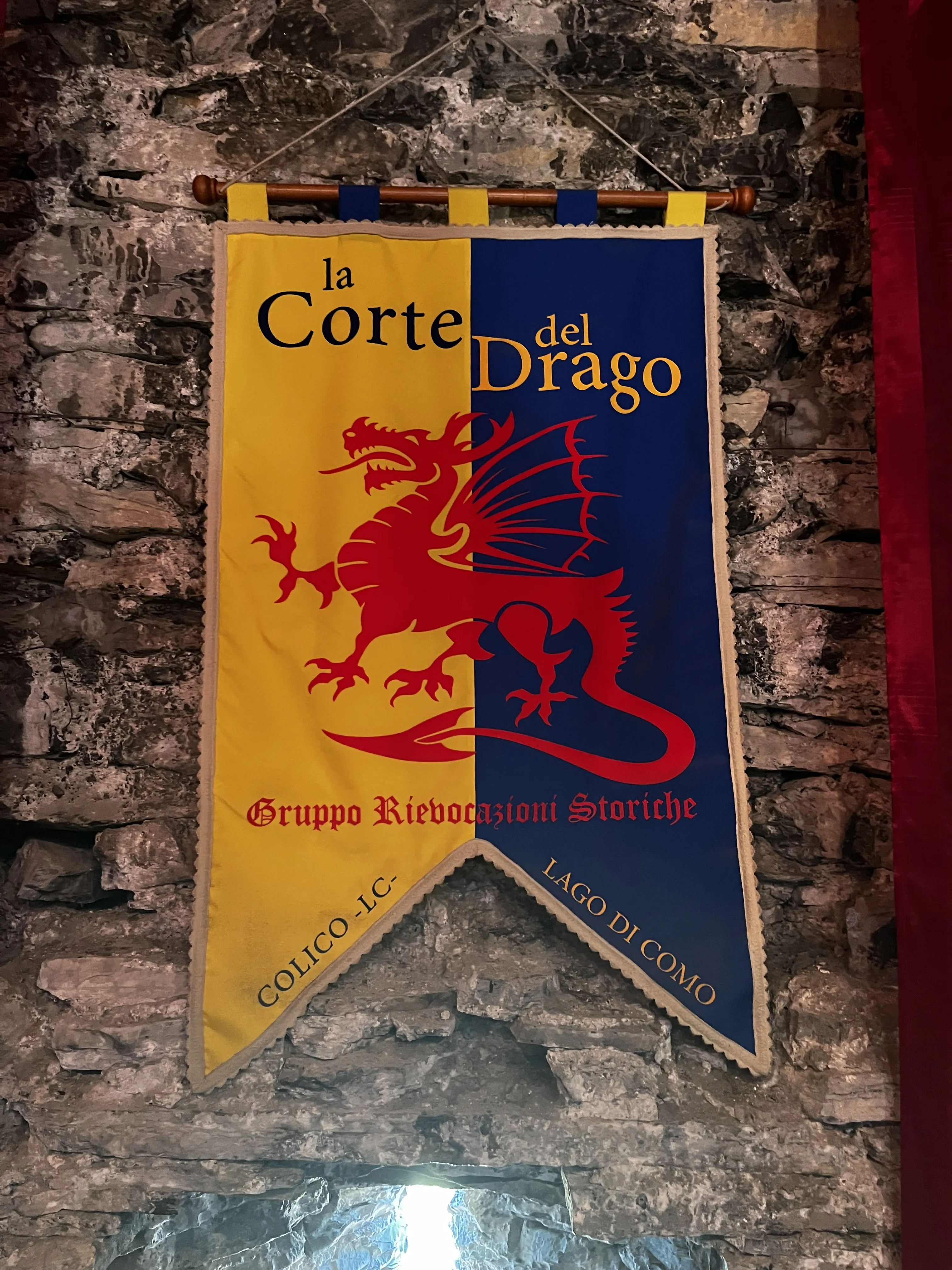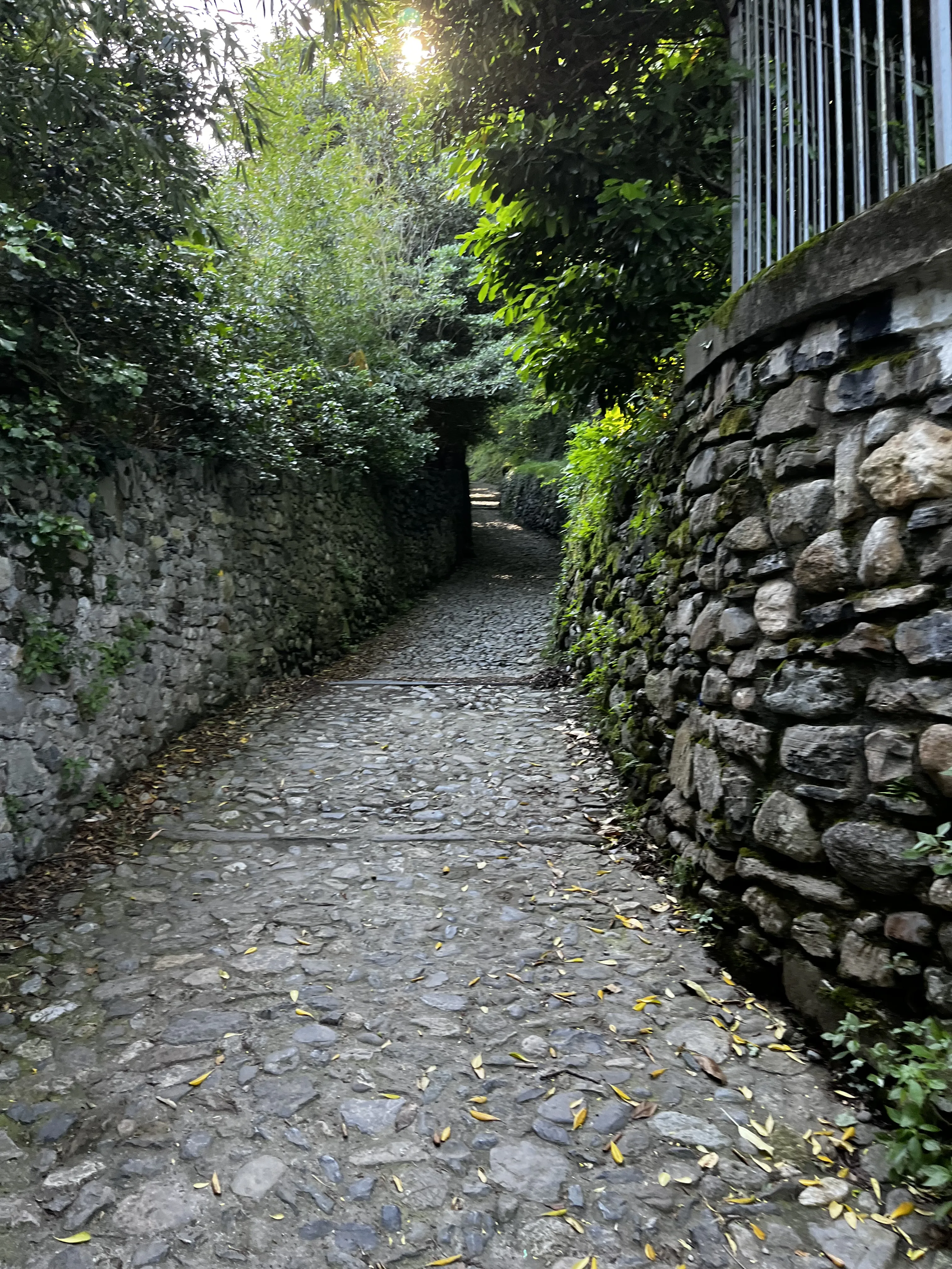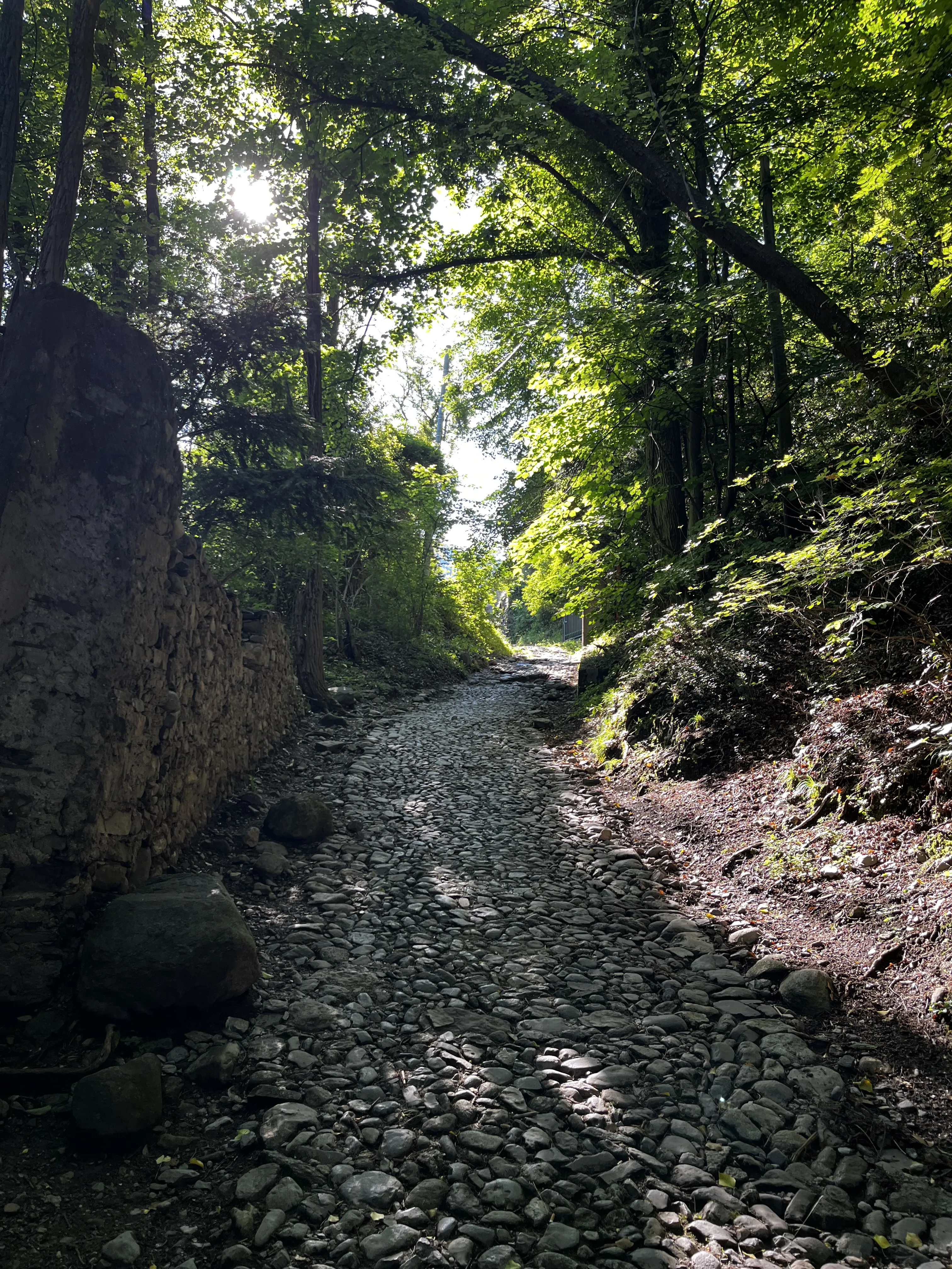 The hike up to Castello Di Vezio was intense – a steep cobbled track that wound its way up the hillside through the forest. After about a 25-minute trek, we reached the top and emerged from the forest trail at the grounds of the castle. We entered the grounds and looked around the gardens, which were lovely – with amazing views of Lake Como in all directions, shouldered by the steep hills and occasional snow-capped mountains.