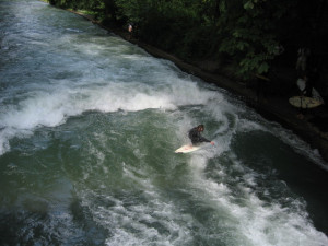 The park is also the home to the Munich river surfers. The river that flows through the park was altered artificially by US solders after the war to entertain themselves. The river was temporarily stopped, and a large piece of concrete put in place to cause a large pressure wave in the river – which provides quite good surfing. It was pretty amazing to see people jumping in on the wave one after another surfing it, and bailing to let the next on.