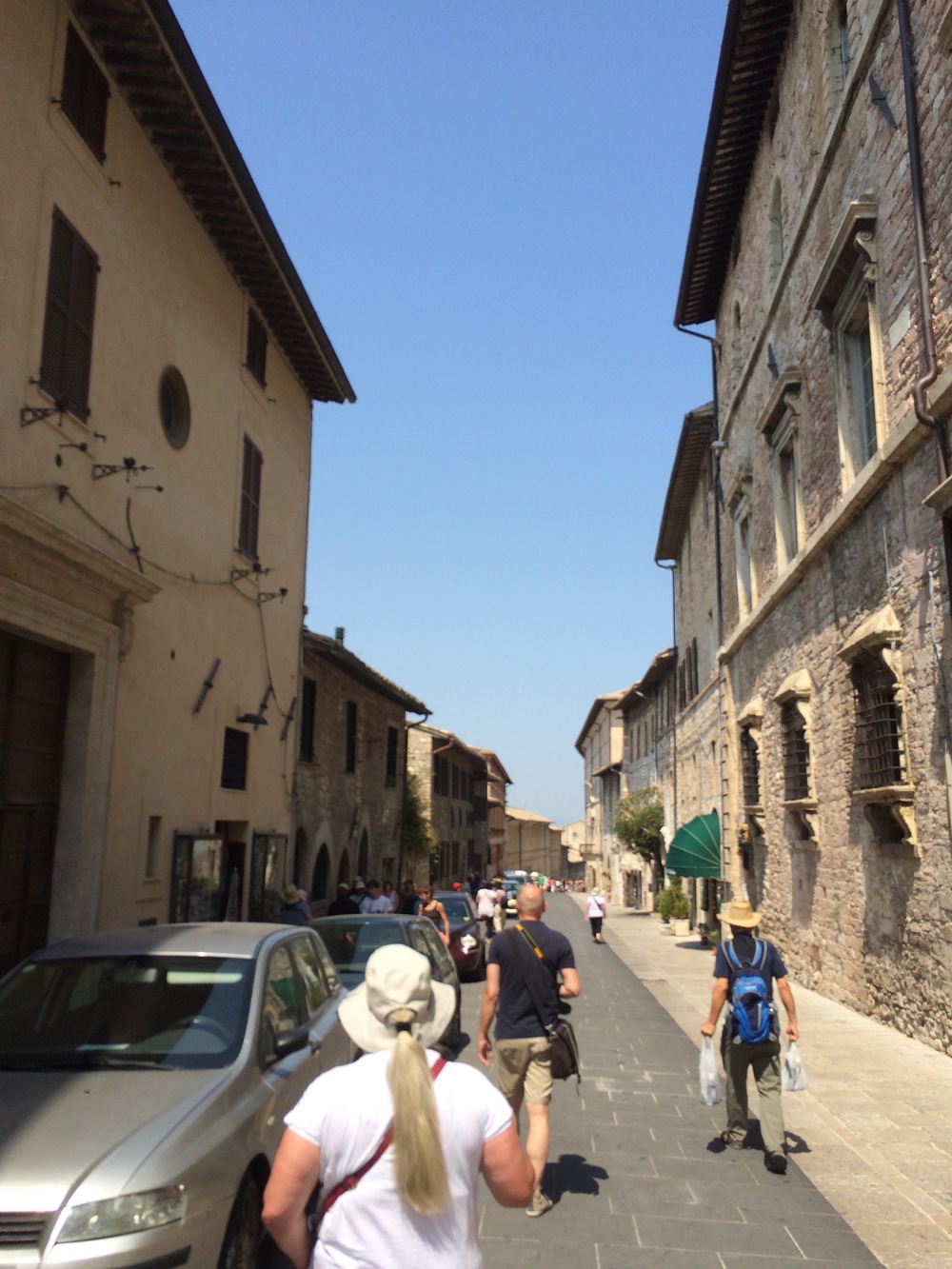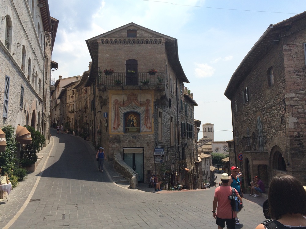 The goat track wound us slowly around and up the side of the hill leading to Assisi. We eventually popped out on the side of the main road where we more comfortably continued heading to the top of the hill found a carpark in Piazza Matteotti.